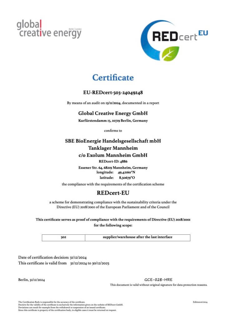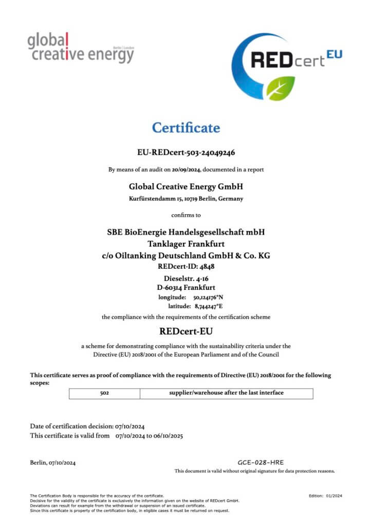 Um die hohe Qualität unseres Biodiesels dauerhaft sicherzustellen, beziehen wir ihn ausschließlich von europäischen Lieferanten, die ebenfalls strenge Qualitätsanforderungen erfüllen. Der Biodiesel wird direkt oder über angemietete Zwischenlager an unsere Kunden geliefert, weshalb auch die Qualität der beauftragten Speditionen und Lagergesellschaften für uns sehr wichtig ist.